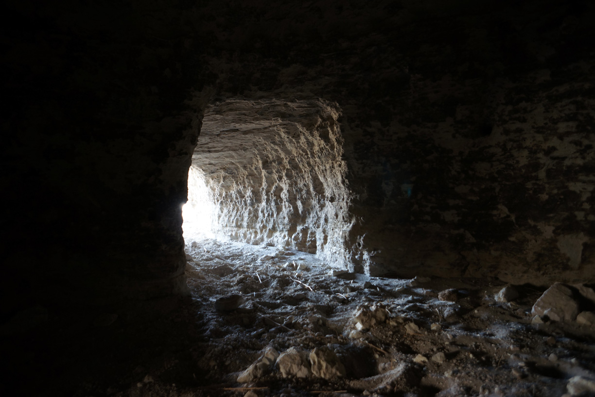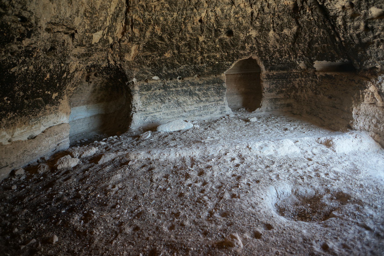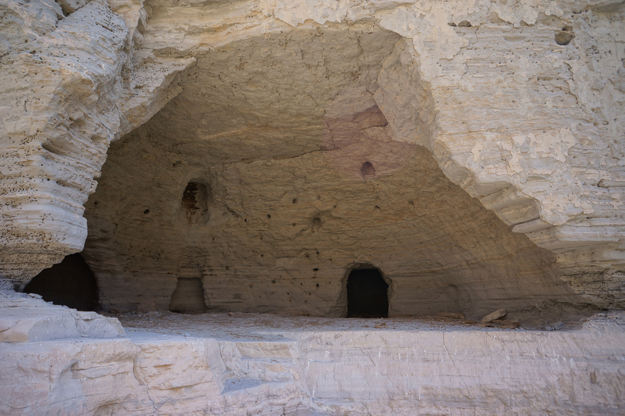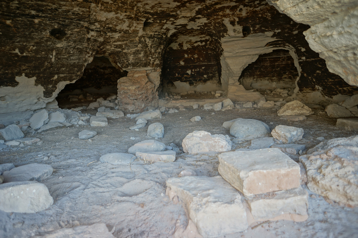 A typical dwelling is characterized by a small opening in the cliff face, perhaps three feet wide by four feet high, that opens up into a round or oblong main room typically fifteen feet across and tall enough to stand up in. The main room will generally have one or more small alcoves for sleeping or storage, and may also have tunnels leading to adjacent dwellings or to rooms deeper into the cliff. The floors are generally flat, in some cases having been built up with rocks and mud plaster, and frequently contain depressions that may have been used for cooking fires. There is some evidence that masonry walls were once used to partition large rooms, and to protect some of the larger entrances. However most of these walls have been destroyed by prehistoric and historic looters, and any portable artifacts have long since disappeared.