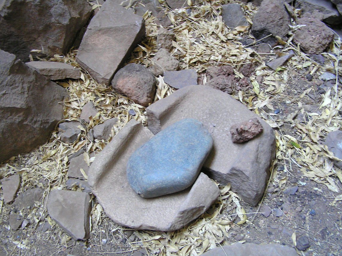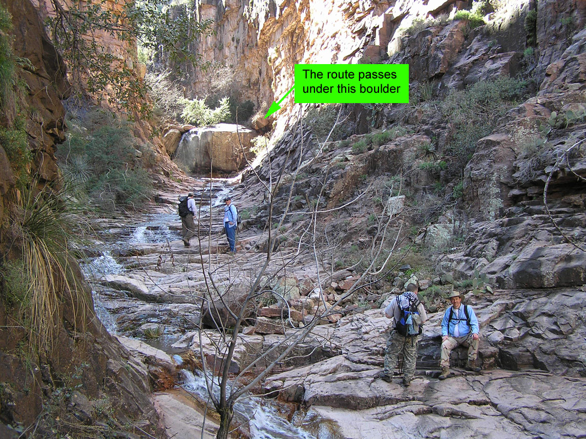 Above the second waterfall, the trail disappears altogether. The best advice I can give is to stay high on the left side of the creek as long as you can, and then drop back into the creek bottom. You won't be able to see the ruin from the creek due to the steep canyon walls. Look for a house-sized boulder wedged against the right side of the creek bottom. If you walk above the boulder you'll find that the trail reappears, leaving the creek and climbing diagonally up the right side of the canyon.
