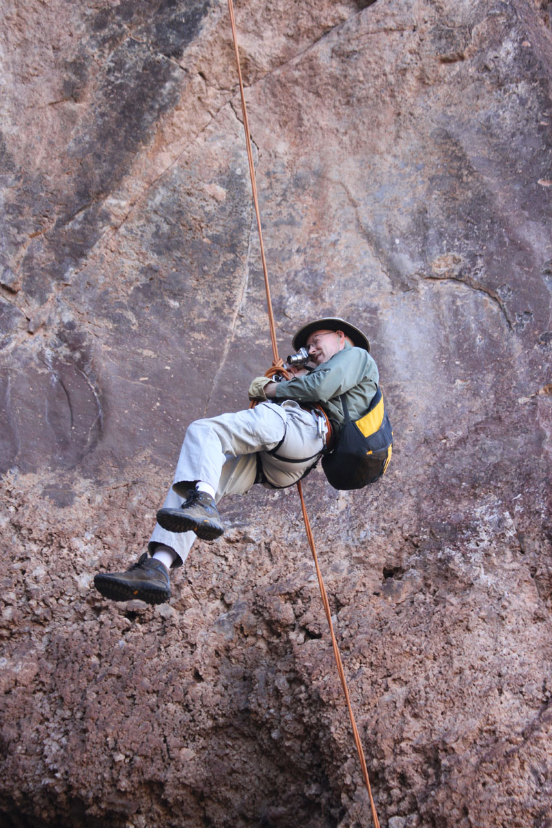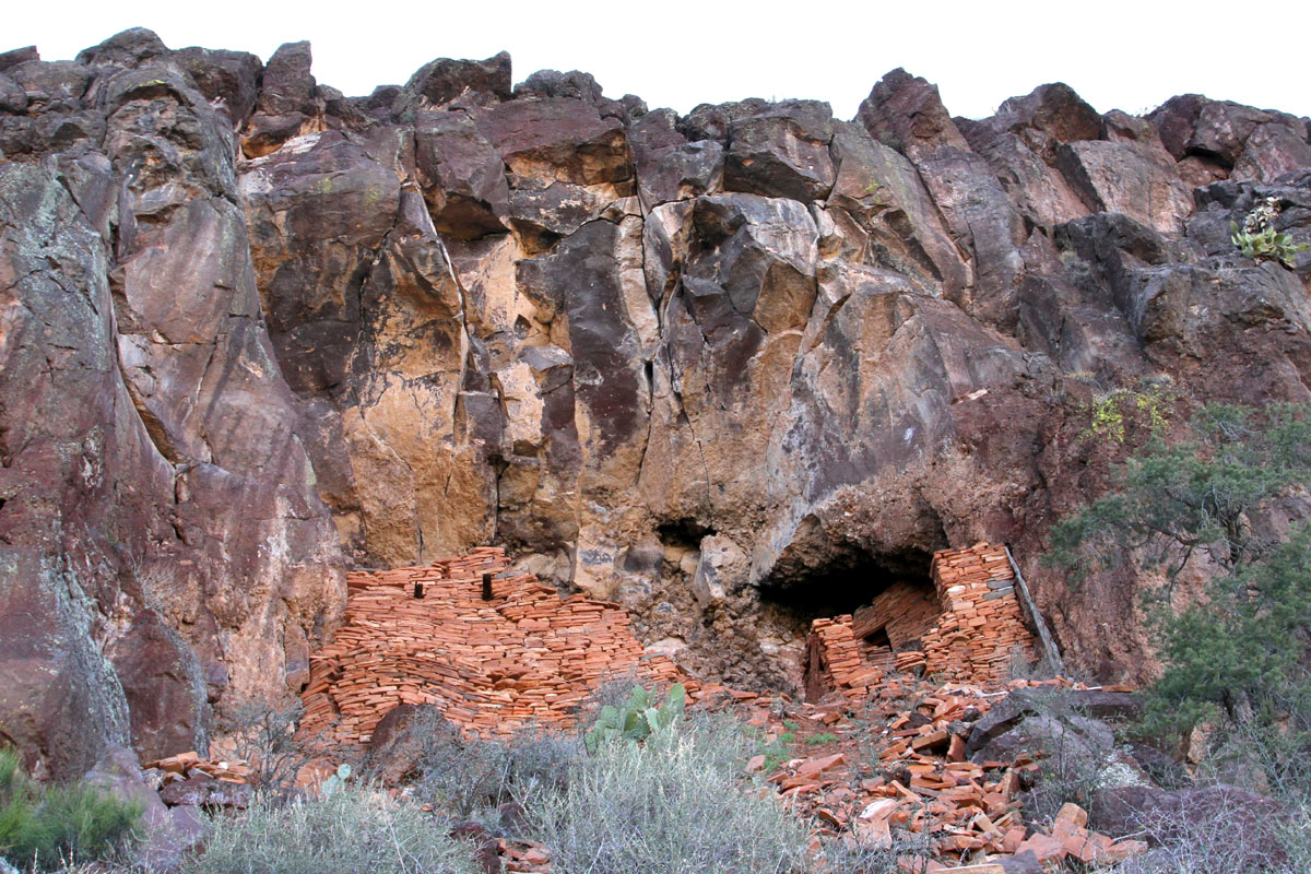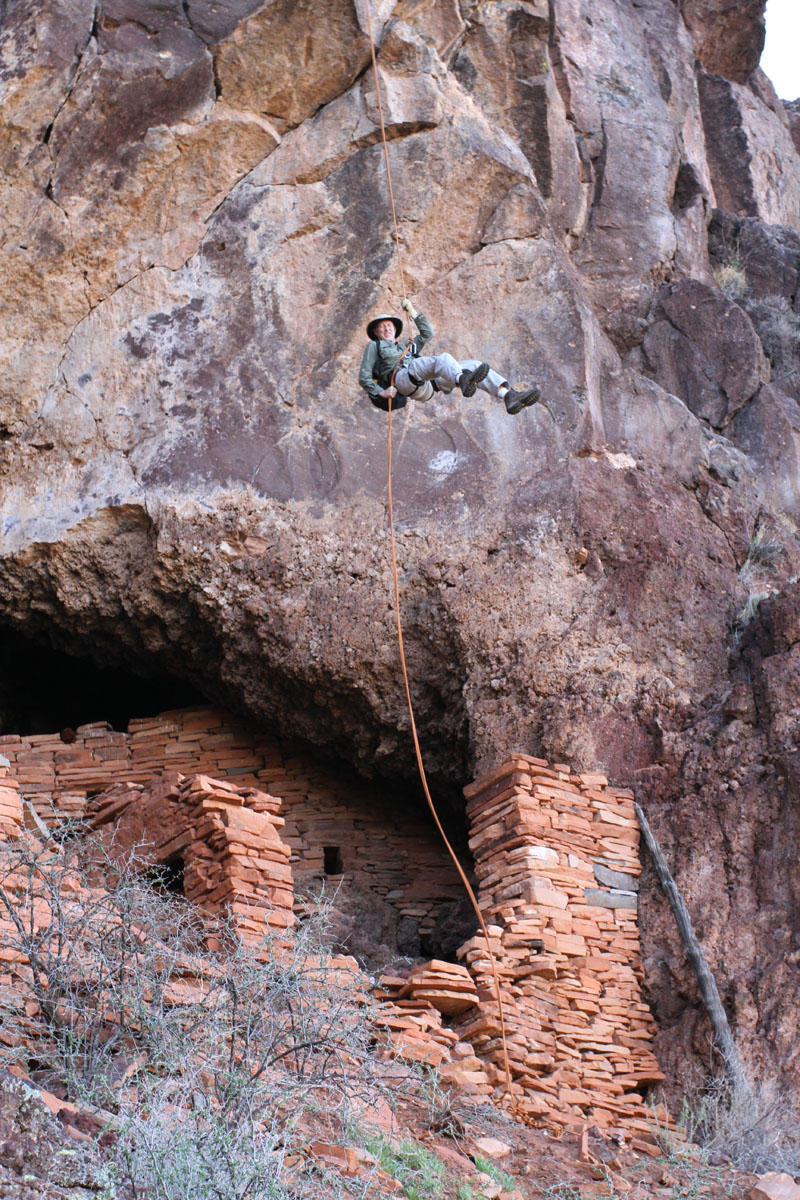 Photo 1 shows an overall view of the Sycamore Canyon cliff dwelling, taken from below. The structure on the left was once two stories high, and the open section in the middle of the ruin was once roofed over and walled off. The remains of the missing walls, presumably destroyed by looters, are now strewn over the slope below the ruin.
