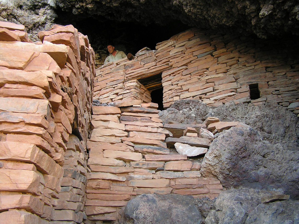 Photo 3 shows a good example of how to construct a masonry wall strong enough to support multiple stories. The wall consists of an inside and outside layer, both carefully dressed on their exposed sides, with the intervening space filled with mud, smaller rocks and rubble. The wall would have been held together with a mud mortar, and the surfaces protected with an inch-thick layer of mud plaster designed to protect the load-bearing components from the elements. This protective plaster has mostly eroded away in the hundreds of years since the structure was occupied, although some can still be seen on the less exposed portions of the walls.
