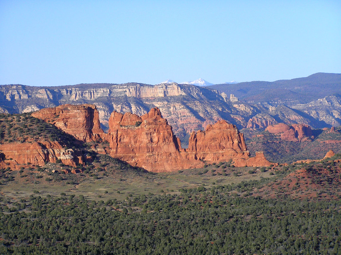 Photo 12 shows the view looking directly out from the ruin. The snow-covered mountain in the distance is Humphreys Peak. Located 20 miles north of Flagstaff, it is the highest mountain in Arizona, at 12,637 feet.