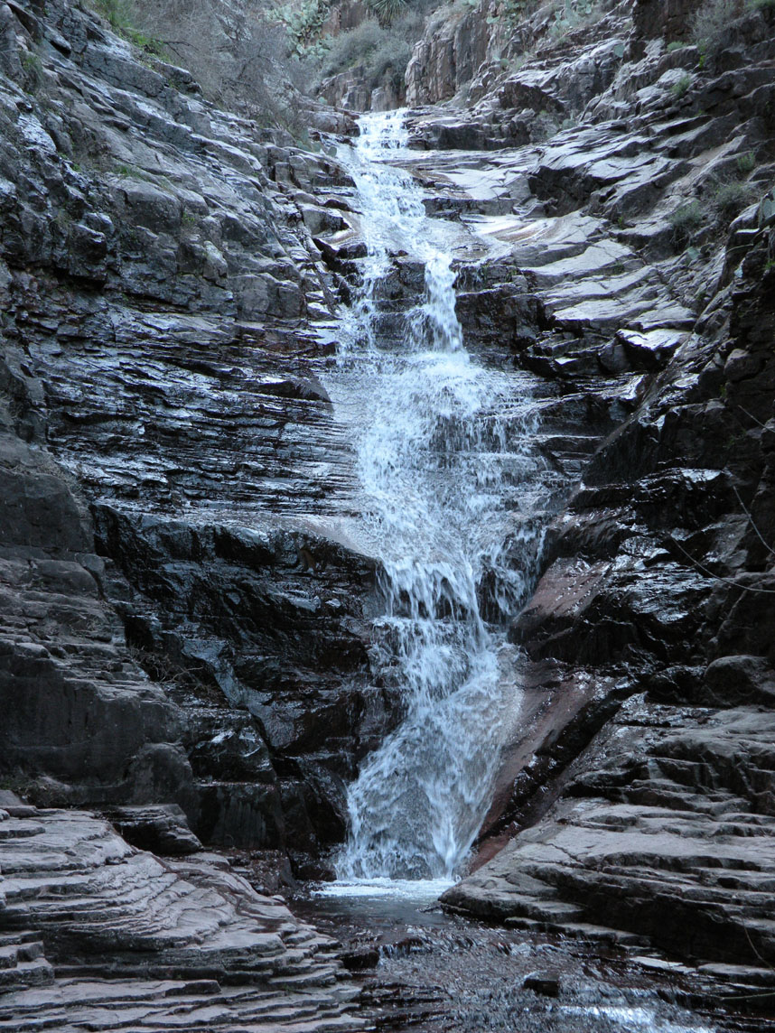 Above the second waterfall, the trail disappears altogether. The best advice I can give is to stay high on the left side of the creek as long as you can, and then drop back into the creek bottom. You won't be able to see the ruin from the creek due to the steep canyon walls. Look for a house-sized boulder wedged against the right side of the creek bottom. If you walk above the boulder you'll find that the trail reappears, leaving the creek and climbing diagonally up the right side of the canyon.