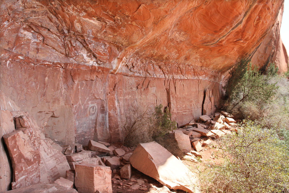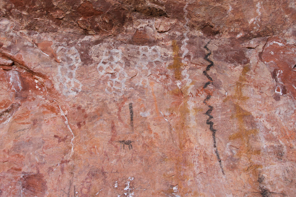 A couple of miles from the Sycamore Canyon cliff dwelling is a protected alcove containing several panels of pictographs. Petroglyphs, which are pecked or scraped into the rock, are common in Arizona; but pictographs, which are colored with pigments, are fairly rare.