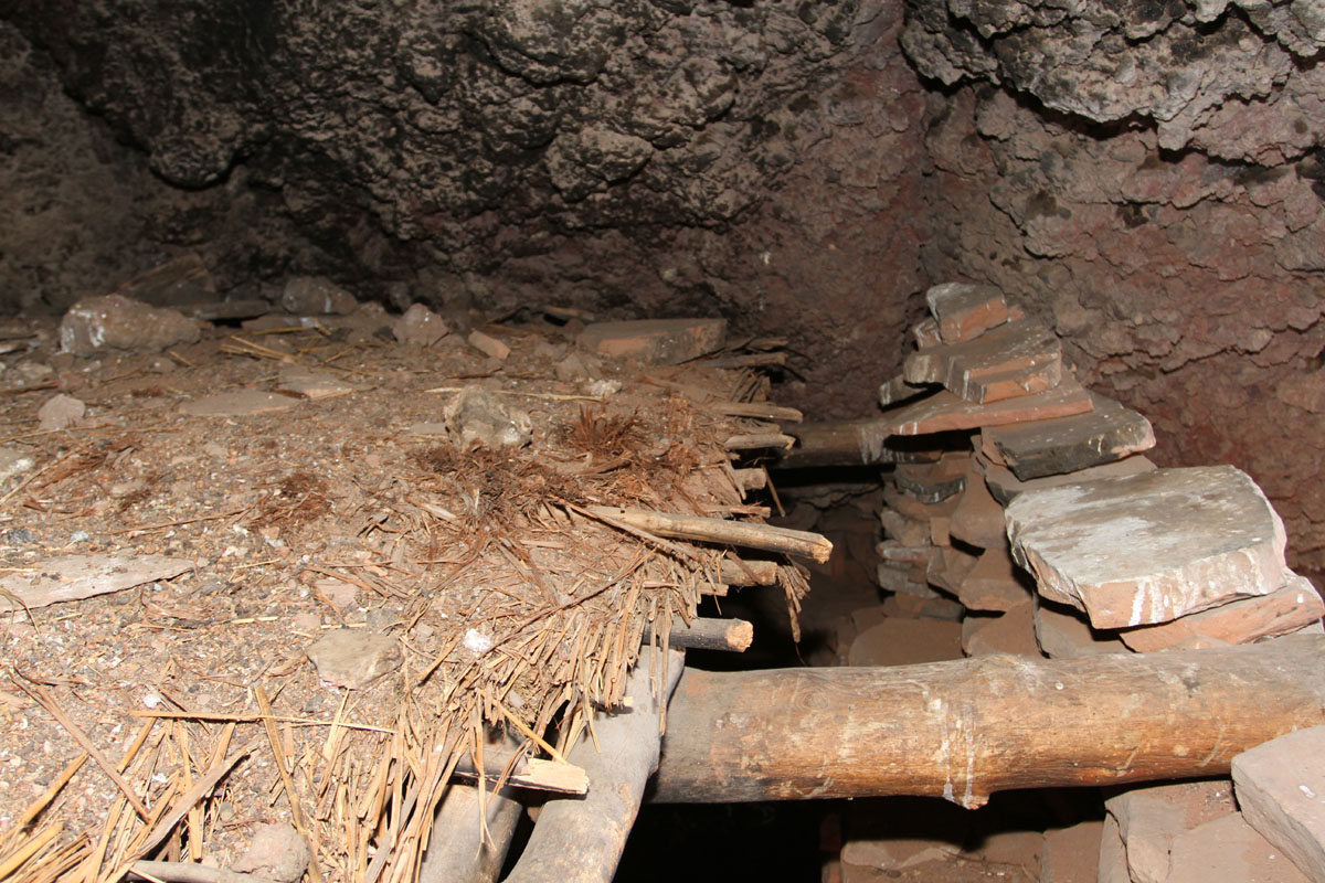 Photos 7 through 9 show how floors were constructed. The largest beams are ten inches thick--the size of telephone poles--and were cut to fit using stone tools. They are crossed at right angles by logs that are six inches in diameter, which in turn are layered with inch-thick branches. This is layered over with straw or thinner branches, and the entire assembly is then covered with two or three inches of mud. This technique was used all over Arizona (see the Sierra Ancha site descriptions, for example), and produced floors that have stood for hundreds of years, strong enough to support occupation of the rooms above.